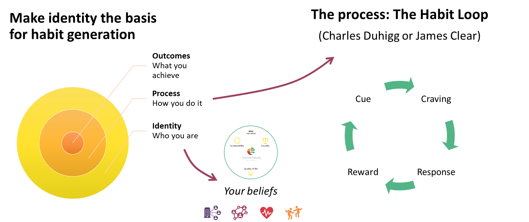 While the Habit Loop is defined quite well by authors Charles Duhigg and James Clear, I didn’t find as many examples for how they regularly filter habits based on their connection to identity and beliefs. James Clear presents a linkage between outcomes, process and identity for which I now understand the connection to the Habits Loop. I didn’t really see a name for it so I guess this is what I like to call it: Identity based behaviour change. Let me know in the comments if this is already well defined by someone including James Clear because I’d love to read about it.