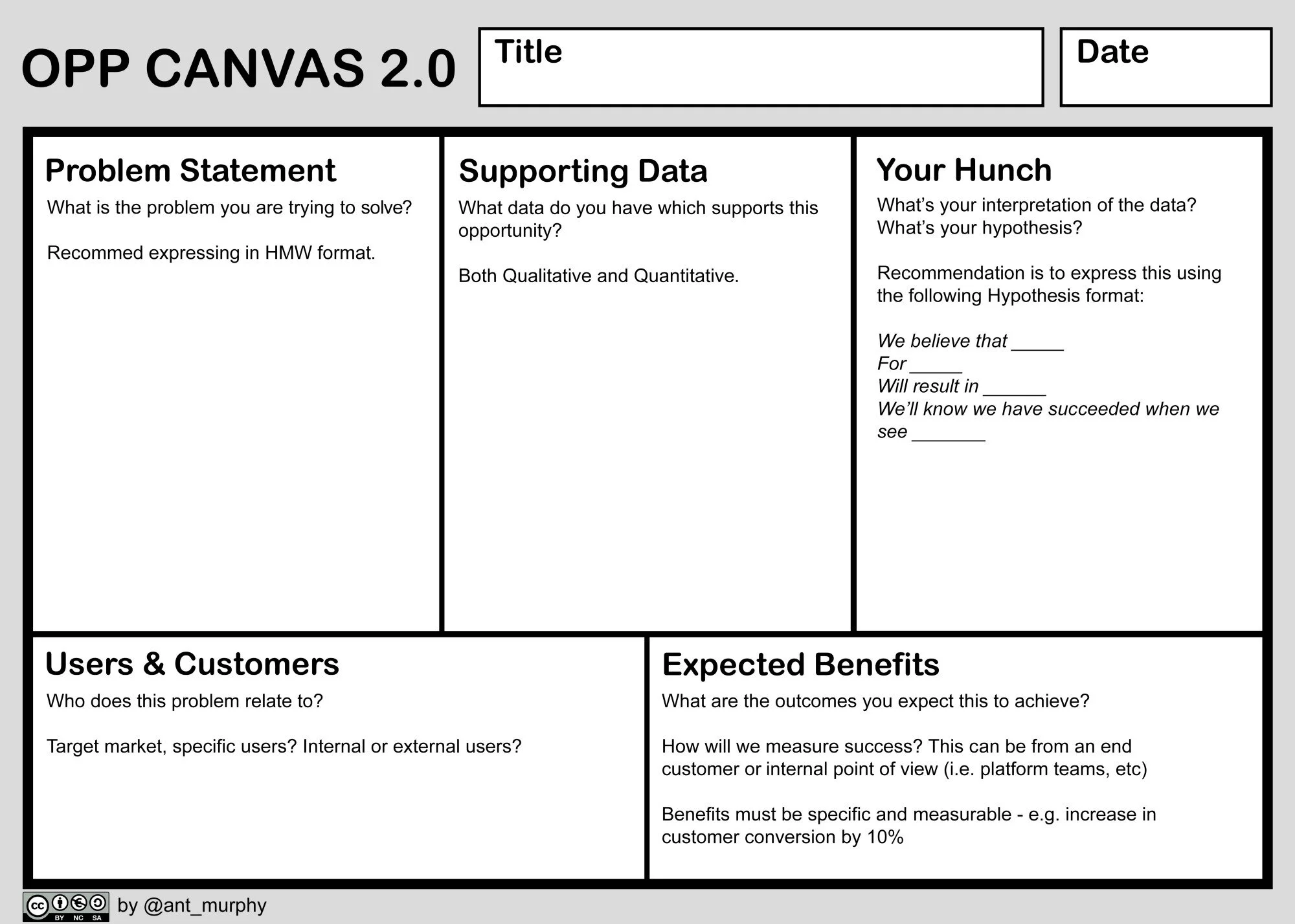 There is no one ‘off the shelf’ design of an opportunity canvas that will be the right fit for your organisation and culture. There are good starting points that may have evolved to suit the context and learnings of particular organisations. Here are two instances of opportunity canvases: